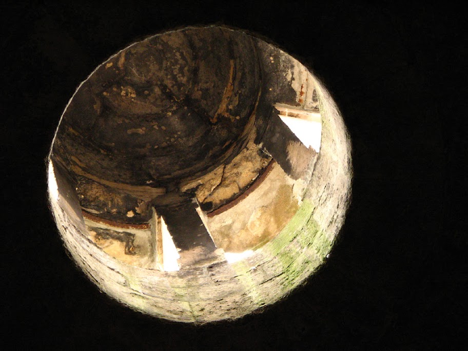 During Heritage Days, on last Saturday, I visited first an old little construction, public only once a year. Le "regard de la Lanterne" in Paris Belleville is small, and yet was very important in the past. This regard (Lantern manhole) is in fact a smart stoned rotunda lit by a skylight. Here is this skylight taken from the inside. This building is the beginning of the Belleville aqueduct, which in the past supplied Paris fountains with water from les "sources du Nord" (North springs). It is no more operational.